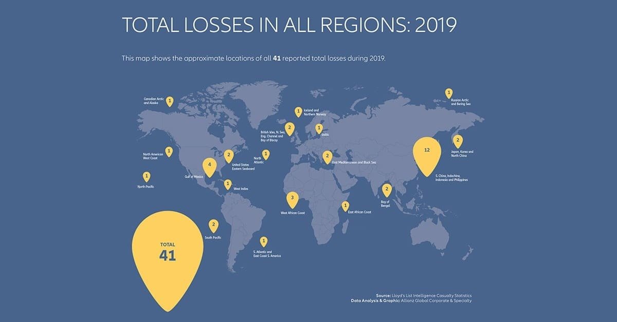- 41 major ships lost worldwide in 2019, a reduction of more than 20% y-o-y and almost 70% in a decade.