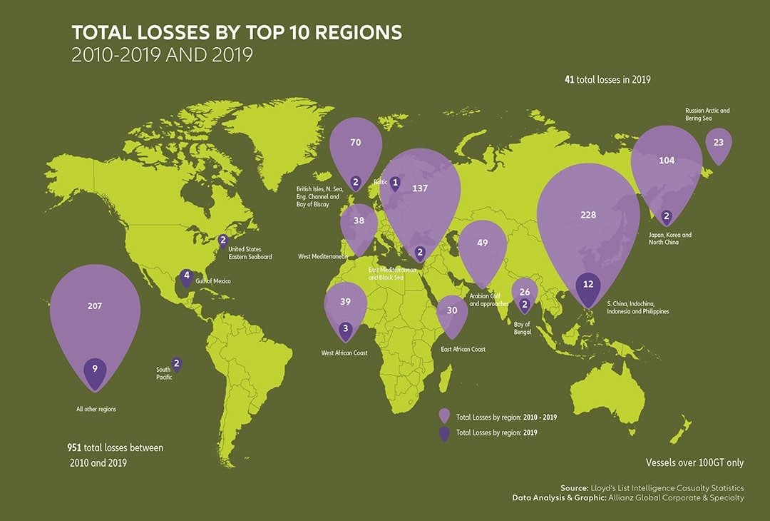 [:pb]De acordo com o relatório, a região marítima do sul da China, Indochina, Indonésia e Filipinas continua sendo o local de maior perda, com 12 navios em 2019 e 228 navios na última década, sendo uma em cada quatro de todas as perdas. Altos níveis de comércio, rotas marítimas movimentadas, frotas mais antigas, exposição a tufões e preocupações com a segurança em algumas rotas de balsas domésticas são fatores contribuintes. No entanto, em 2019, as perdas diminuíram pelo segundo ano consecutivo. O Golfo do México (4) e a Costa Oeste da África (3) estão em segundo e terceiro lugar.