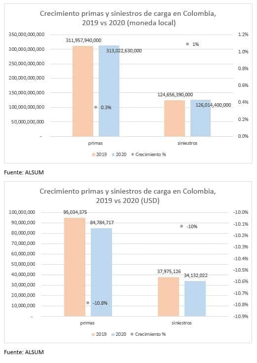 Las primas de carga en 2020 presentaron un incremento del 0,3% en pesos colombianos y en dólares este porcentaje decreció un 10,8%, debido al impacto de la devaluación. De acuerdo con las cifras, en diciembre de 2019 el mercado obtuvo ingresos en seguros de carga por valor de USD 95 millones y en 2020 el valor fue de USD 84 millones. Por otro lado, los siniestros en moneda local crecieron en 1% y en dólares la caída fue de 10%.