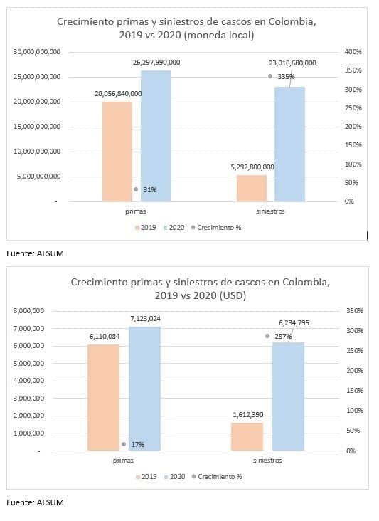 Las primas de cascos en 2020 presentaron un crecimiento del 31% en pesos colombianos y en dólares este porcentaje fue de 17%, debido al impacto de la devaluación. De acuerdo con las cifras, en diciembre de 2019 el mercado obtuvo ingresos en seguros de cascos por valor de USD 6 millones y en 2020 el valor fue de USD 7 millones. Por otro lado, los siniestros en moneda local crecieron en 335% y en dólares el incremento fue de 287%.