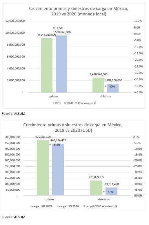 Las primas de carga en 2020 presentaron un incremento del 4,5% en pesos mexicanos y en dólares este porcentaje decreció un 6,4%, debido al impacto de la devaluación. De acuerdo con las cifras, en diciembre de 2019 el mercado obtuvo ingresos en seguros de carga por valor de USD 475 millones y en 2020 el valor fue de USD 445 millones. Por otro lado, los siniestros en moneda local decrecieron en 40% y en dólares la caída fue de 47%.