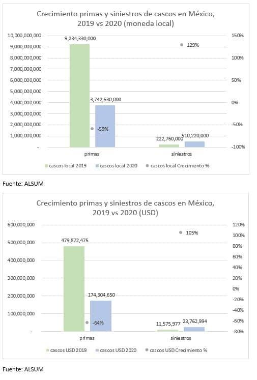 Las primas de cascos en 2020 presentaron un decrecimiento del 59% en pesos mexicanos (impacto de la póliza de Pemex) y en dólares este porcentaje disminuyó un 64%, debido al impacto de la devaluación. De acuerdo con las cifras, en diciembre de 2019 el mercado obtuvo ingresos en seguros de cascos por valor de USD 479 millones y en 2020 el valor fue de USD 174 millones. Por otro lado, los siniestros en moneda local crecieron en 129% y en dólares el incremento fue de 105%.