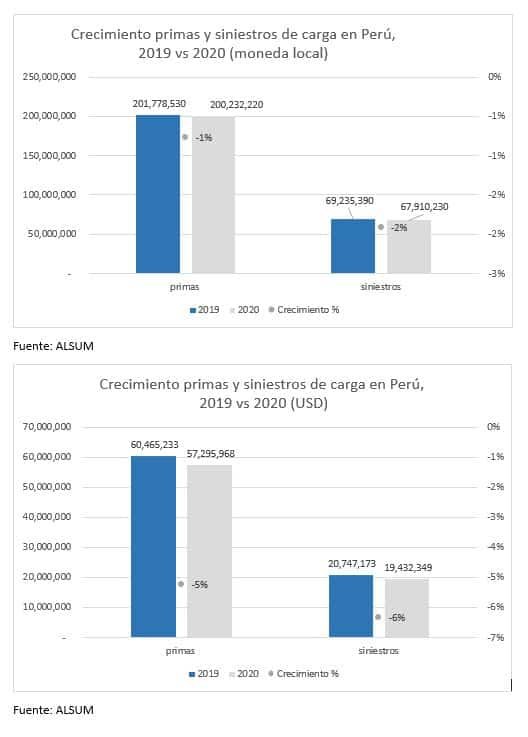 Las primas de carga en 2020 presentaron una caída del 1 % en soles y en dólares este porcentaje decreció un 5%, debido al impacto de la devaluación. De acuerdo a las cifras, en diciembre de 2019 el mercado obtuvo ingresos en seguros de carga por valor de USD 60 millones y en 2020 el valor fue de USD 57 millones. Por otro lado, los siniestros en moneda local decrecieron en 2% y en dólares la caída fue de 6%.