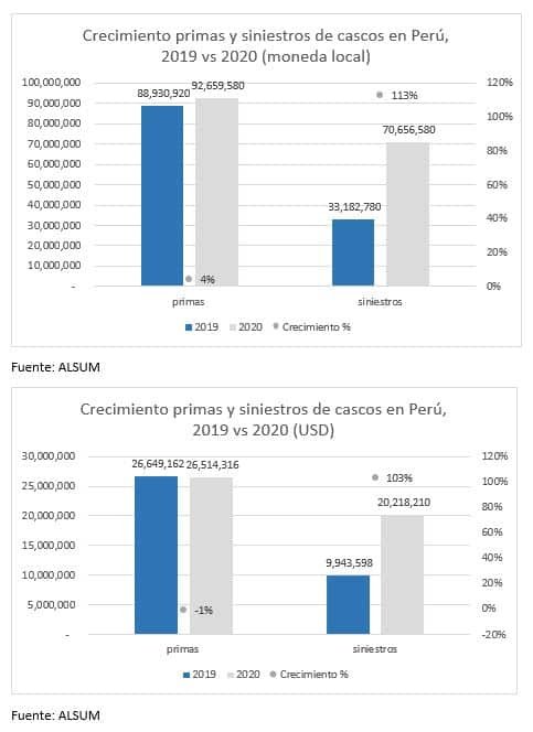 Las primas de cascos en 2020 presentaron un crecimiento del 4% en soles y en dólares este porcentaje fue de -1%, debido al impacto de la devaluación. De acuerdo a las cifras, en diciembre de 2019 el mercado obtuvo ingresos en seguros de cascos por valor de USD26,6 millones y en 2020 el valor fue de USD 26,6 millones. Por otro lado, los siniestros en moneda local crecieron en 113% y en dólares el incremento fue de 103%.