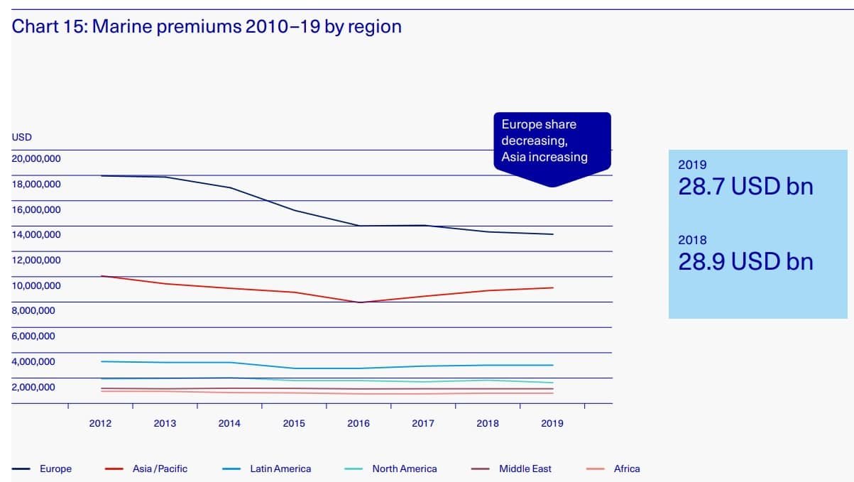 Global marine insurance premiums in 2019 amounted to USD 28.7 billion and are relatively stable compared to 2018. Asia Pacific region continues to increase its market share. Confidence in a modest market recovery now seems less secure due to the impact of COVID-19 but the first signs are encouraging.