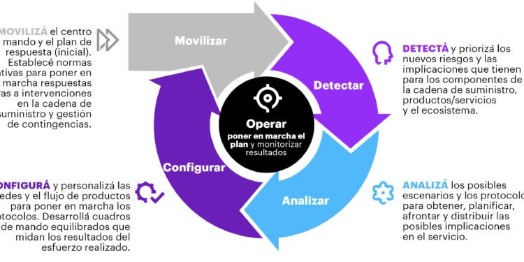 Asegura que las compañías deben actuar seguras y con rapidez para diseñar y ejecutar planes tácticos en el corto plazo que mitiguen los riesgos en la seguridad y la salud de las personas y que protejan el funcionamiento de las cadenas de suministro globales. Poner en marcha un ciclo continuo de movilización, detección, análisis, configuración y operaciones ayudará a optimizar los resultados y a mitigar riesgos.