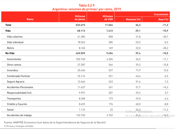 El volumen de primas del mercado asegurador argentino (anualizadas a diciembre de 2019), fue de 533.673 millones de pesos (11.066 millones de USD), lo que supone un incremento nominal del 36,3% mientras que el real arroja una contracción del -11,2% respecto al mismo período del año previo.