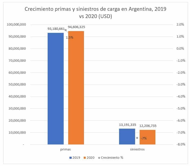Según estimaciones realizadas por ALSUM, las primas de carga en 2020[1] presentaron un crecimiento del 48,6% en pesos argentinos y en dólares este porcentaje fue de solo 1,5%, debido al impacto de la devaluación. De acuerdo con las cifras, en 2019 el mercado obtuvo ingresos en seguros de carga por valor de USD 93 millones y en 2020 el valor fue de USD 94 millones. Por otro lado, los siniestros en moneda local crecieron en 35% y en dólares la caída fue de 7%.