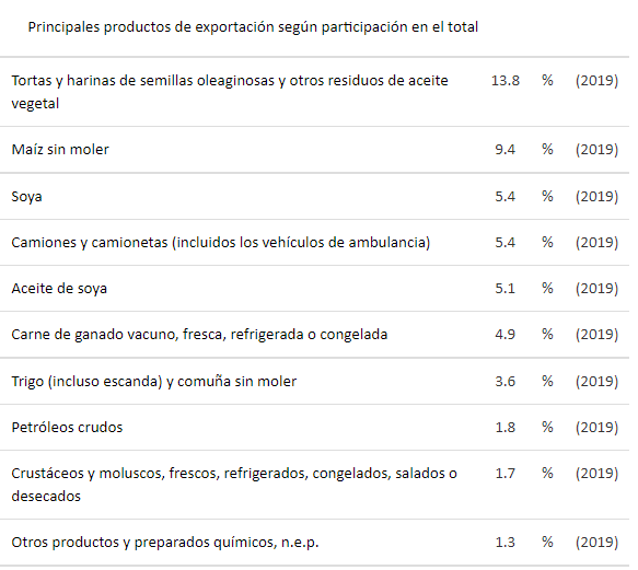 De acuerdo con datos suministrados por la CEPAL, los mayores productos que exporta Argentina están relacionados con la agroindustria y sus derivados. En 2019, las tortas y harinas de semillas oleaginosas y otros residuos de aceite vegetal, representaron el 13,8% del total de las exportaciones, seguidos por maíz sin moler (9,4%), soya (5,4%) y camiones / camionetas (5,4%).