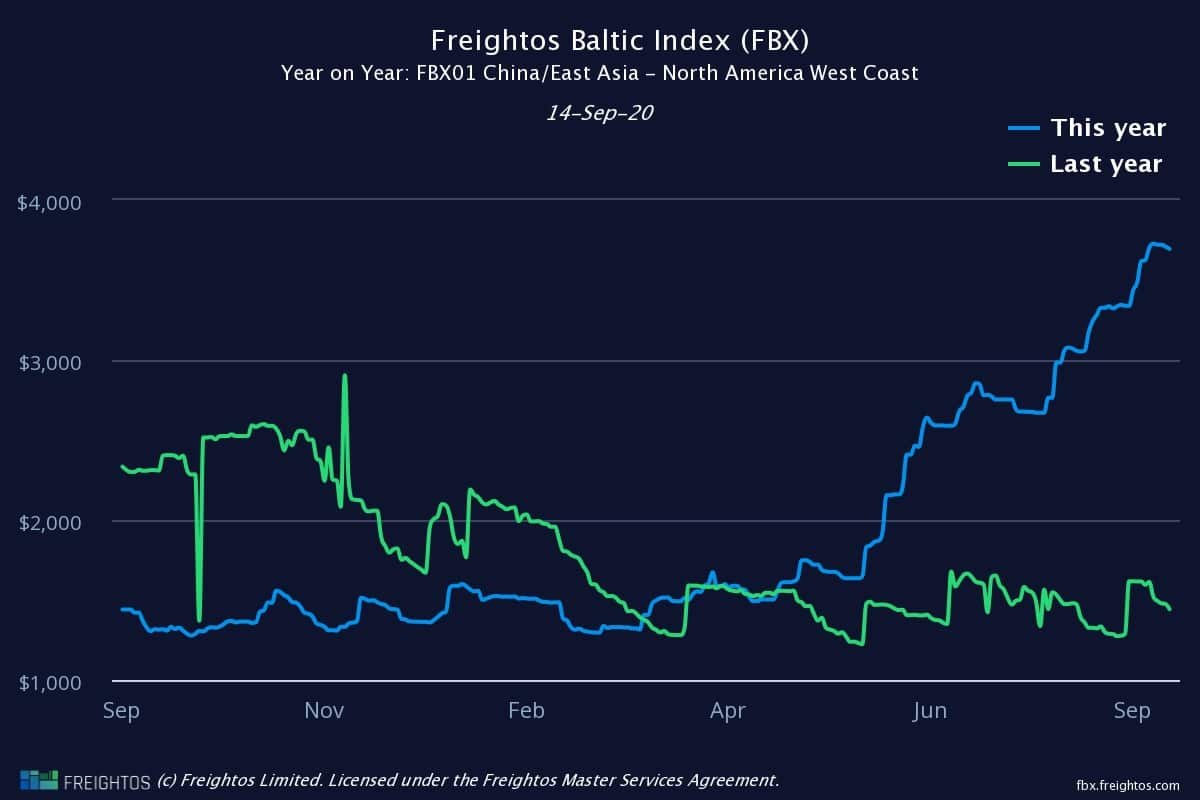 Las tarifas marítimas desde China a los EE. UU., según lo reporta el portal Freightos, han continuado su aumento constante con seis aumentos de tarifas generales consecutivos (GRI) desde el 1 de junio de 2020. Un séptimo GRI anticipado a mediados de septiembre impulsaría las tarifas de la costa este de China a casi $ 4,500 por FEU y las tarifas de la costa oeste hasta casi un 160% con respecto al año pasado.