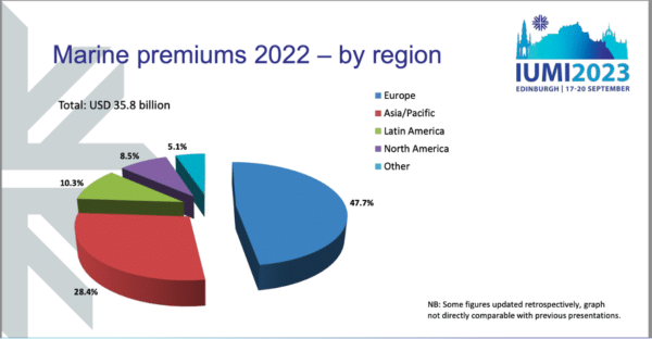 La IUMI en su reciente conferencia anual de Edimburgo, reportó que las primas de marine a nivel mundial para 2022 alcanzaron los USD 35,8 mil millones, lo que representa un aumento del 8,3% en comparación con 2021. Según las líneas de negocio, carga representó el 57,3% del total, seguida por cascos con 23,4%, offshore con 11,5% y responsabilidad marítima aportó el 7,7%.