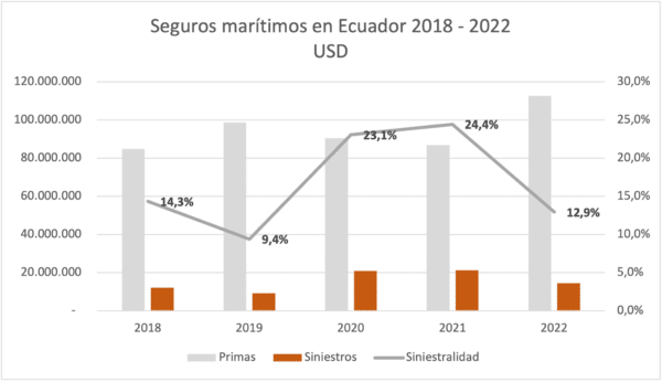 En 2022, la economía ecuatoriana recuperó su impulso a pesar de las pérdidas ocasionadas por las paralizaciones lideradas por el movimiento indígena en una movilización durante 18 días contra el alto costo de vida y la política económica del Gobierno del presidente Guillermo Lasso. Las primas del país en seguros marítimos se ubicaron en USD 112 millones, reflejando un crecimiento de 29,7% respecto a 2021. En relación con el seguro de carga presentó un aumento en primas de 16,4% versus el año anterior. Las compañías ecuatorianas reportaron en el seguro de cascos, un aumento del 52% respecto al 2021.