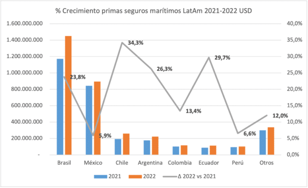 Brasil representó el 44,1% de las primas totales de la región, lo que lo convierte en uno de los países líderes del seguro marítimo en América Latina. Para 2022 las primas del país se ubicaron en USD 1.450 millones, reflejando un crecimiento de 23,7% respecto a 2021. En relación con el seguro de carga presentó un aumento de 33,7% versus el año anterior. Las compañías brasileñas reportaron en el seguro de cascos, un crecimiento del 27,9% respecto a 2021. El reporte en los ramos de RC, junto con riesgos portuarios y petroleros registró un crecimiento de 18,3%.