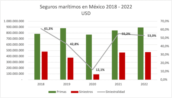 México es el segundo mercado más importante de la región, representando un 29% de las primas totales del seguro marítimo en América Latina. Para 2022 los ingresos por seguros marítimos del país se ubicaron en USD 892 millones, reflejando un crecimiento de 6% en comparación a 2021. En relación con el seguro de carga presentó un aumento en primas de 9% versus el año anterior. Las compañías mexicanas reportaron en el seguro de cascos, un crecimiento del 3% respecto a 2021.