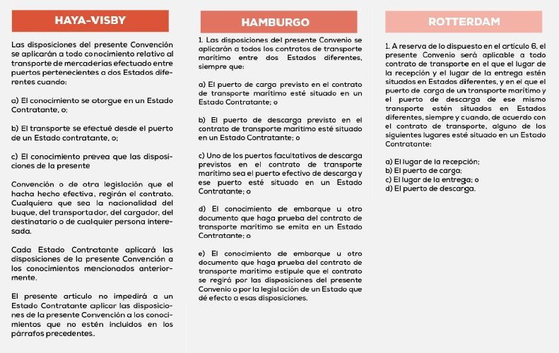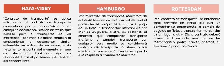 Claramente se observa que las Reglas de la Haya-Visby son un poco más restrictivas en su alcance, ya que delimitan al contrato de transporte, como aquel acreditado únicamente por un conocimiento de embarque u otro documento similar. Mientras que Hamburgo es mucho más extenso en su alcance, pero se restringe al solo admitir gobierno sobre el trayecto marítimo. En contrario, Rotterdam se desarrolla de forma más amplia e incluye para ciertos casos el tramo por otros medios de transporte, cuando este incluya de forma total o parcialmente un tramo marítimo.